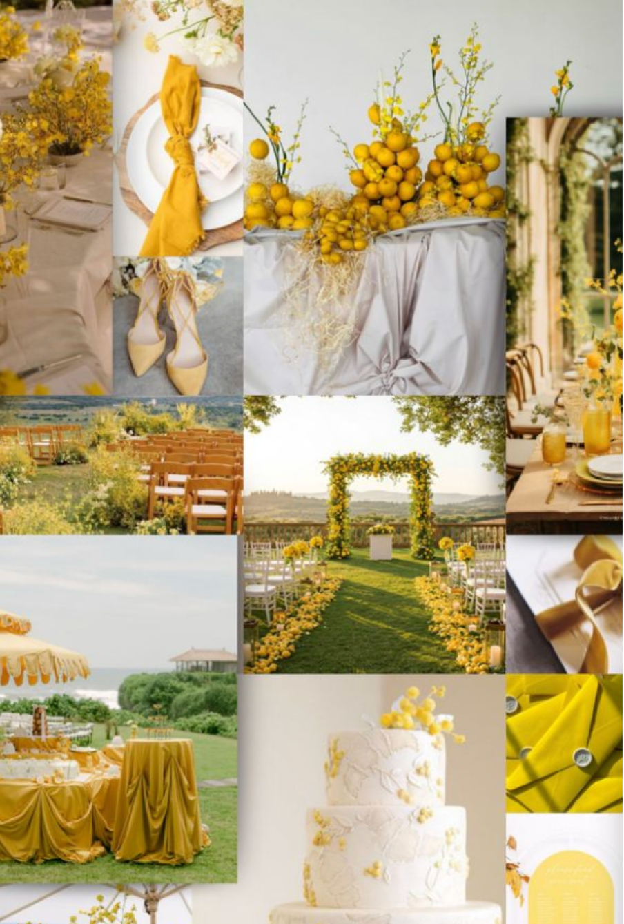 A bright summery colour, perfect for spring time and outdoor weddings. Pair with white for a simple colour palette and let the yellow be the focal point. Don’t by shy with this colour, use it boldly to pull it off.